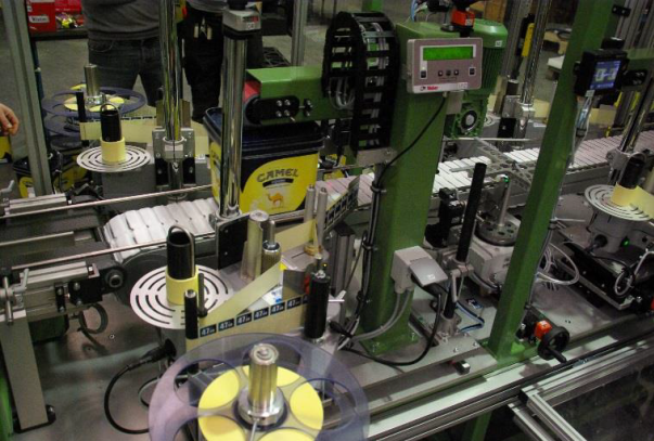 Machine for labelling adhesive labels on buckets for roll tobacco on 4 sides and on the bottom